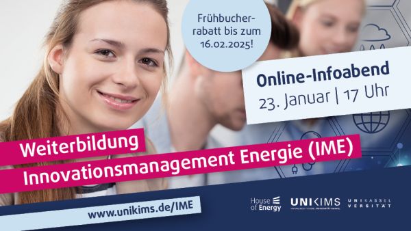 Im Frühjahr 2025 beginnt der fünfte Jahrgang des berufsbegleitenden Zertifikatsprogramms 'Innovationsmanagement Energie' (IME). Fach- und Führungskräfte lernen in sechs Monaten, wie sich Unternehmen für die Energieversorgung der Zukunft rüsten. Die Weiterbildung wird von der Managementschool der Universität Kassel in Kooperation mit House of Energy e.V. angeboten. Sie vermittelt Schlüssel- und Fachkompetenzen, um zukunftsfähige und wertsteigernde Produkte, Prozesse und Energiesysteme zu entwickeln und erfolgreich zu implementieren. Teilnehmende erlernen neue komplexe Herausforderungen zu meistern – in einer Welt, in der Energieversorgung und Klimaschutz neu gedacht werden, die Digitalisierung Einzug hält, Branchengrenzen verschwimmen und Geschäftsmodelle sich verändern.